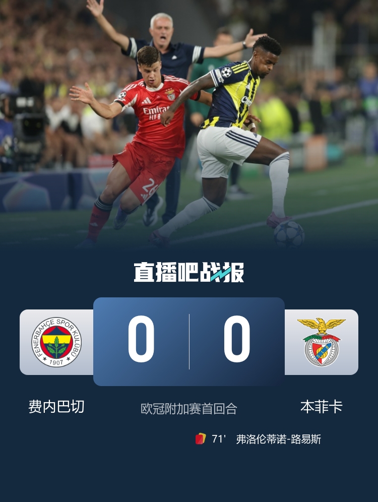 费内巴切0-0本菲卡,双方次回合将在28日凌晨移师本菲卡主场。
