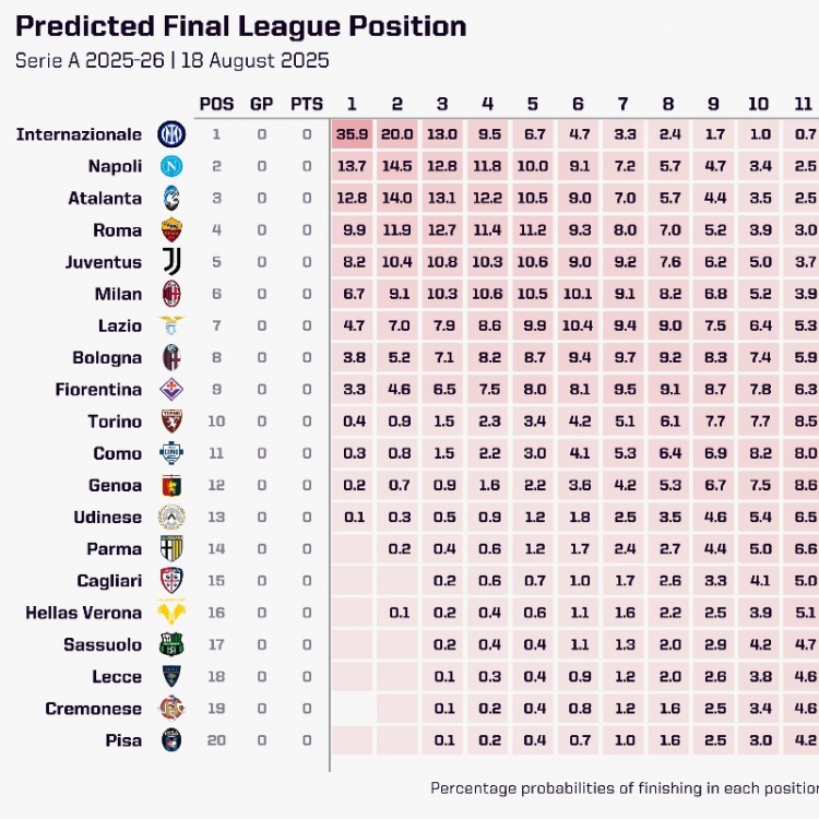 opta通过超级计算机预测本赛季意甲排名,国米有35.9%的概率夺冠